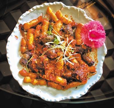 這道美食曾上過《舌尖上的中國(guó)》,它的神秘感來自于食材:發(fā)子色澤暗紅,面腸通體白凈,配以鮮紅的辣椒油,色澤亮麗,風(fēng)味獨(dú)特。發(fā)子是將新鮮羊心、羊肺、羊肉剁碎,拌以蔥、油、調(diào)味品,撒以適量面粉,制成餡子,裝入羊腸中,入火蒸好后,切段入盤。面腸以面粉為主料,配以調(diào)味品,灌入羊小腸中,放入蒸籠約蒸15分鐘,中間須針刺泄氣,以防破裂,熟后切段入盤。按臨夏習(xí)慣,發(fā)子面腸組合成一道菜,盤底放面腸,上面放發(fā)子,再放入辣椒油、蒜泥、香醋等即可享用。