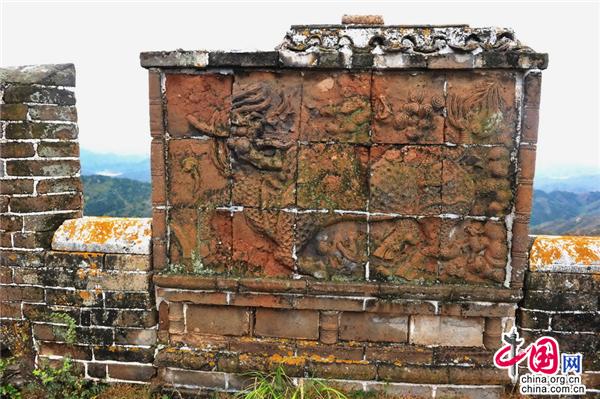 這是中國長城極為罕見、金山嶺長城的四絕之一:麒麟影壁。 它位于金山嶺長城東段的“小狐頂樓”之上。影壁墻高2米,寬2.5米,四邊鑲有磚框,中間用15塊(橫向5塊、豎向3塊)方磚,拼制成一幅浮雕的畫面,畫面中麒麟的神態(tài)動感十足,它腳踏祥云,挺胸翹尾,鬣毛飛揚,頭回扭,張口吐舌,雙眼望向身后樓櫓上的望亭,為金山嶺長城增添了幾分活力。