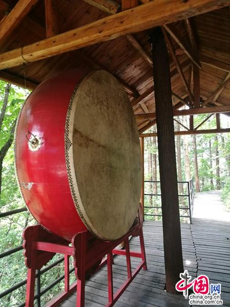 不知是何等神力相助,我竟然氣不急喘,腿不灌鉛,一口氣沖到了大鐘處。在一處長約兩百米,寬約五六米的突兀石崖下,竟然有一條長百米寬約三米的平坦棧道,直抵懸崖石壁,仿佛一條地道的天街。從懸崖上吊掛下來一尊重達千斤的銅鐘,鐘邊吊一根木質鐘錘,錘身已裂開,兩頭均被撞成起毛的“絨團”,由此可知,到達此處撞鐘的勇士并非少數(shù)。我乘興上去重重地撞了九下,雄渾、恢弘的鐘聲,在峽谷上空久久地回蕩。
