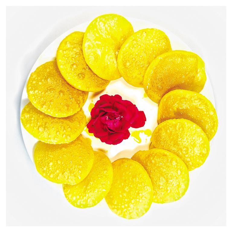 折橋?yàn)车拿媸持?,燙面油香的地位自比尋常,往往在冷熱拼盤交錯(cuò)中,它已經(jīng)被端上桌,因?yàn)樗钦蹣驗(yàn)橙思抑凶罹呦笳饕饬x的一種食物。油香炸得好不好,就可以衡量出這家農(nóng)家樂廚師的技藝。
