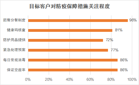 在旅游運(yùn)營商選擇方面,區(qū)別于以往的“先看價(jià)格,再看服務(wù)”,客戶更關(guān)注“是否提供防疫保障,能否有效落實(shí)”。九成以上客戶表示,旅游過程中團(tuán)餐應(yīng)嚴(yán)格采用分餐制度,最大化保障用餐安全;八成以上客戶認(rèn)為,需要嚴(yán)控旅游大巴空座率、做好日常消毒工作。