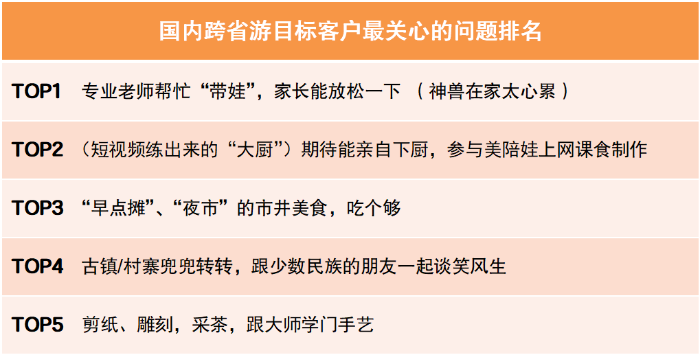 通過針對中青旅遨游網(wǎng)會員、中青旅聯(lián)盟成員單位的忠實(shí)客戶等群體的調(diào)研,以及近半年中青旅遨游網(wǎng)搜索、瀏覽的監(jiān)測數(shù)據(jù)進(jìn)行綜合分析。結(jié)果顯示,西南和西北是客戶喜好程度最高的兩大地域;云南、江蘇、新疆、三亞、陜西是客戶喜好程度最高的五大熱門目的地??蛻糇铌P(guān)心的問題,帶娃、參與、美食、閑逛、學(xué)藝則位列前五名。