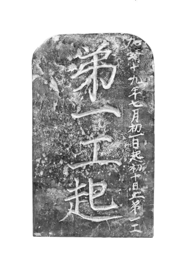 這塊“長(zhǎng)城工牌”,高19厘米,寬11.5厘米,厚2厘米。兩面陰刻楷書(shū),共58字,正面豎刻兩行字,共22字,正中刻“弟一工起”四個(gè)大字,右邊刻“加靖十九年七月初一日起初十日止第一工”一行小字;背面文字分上下兩部分,共36字。上部刻四個(gè)大字“蔡止梅起”。下部豎刻六行32個(gè)小字“一工李清隊(duì)起,二工梅喜隊(duì),三工王元隊(duì),四工侯勛隊(duì),五工位宗隊(duì),六工張曇隊(duì)止”。