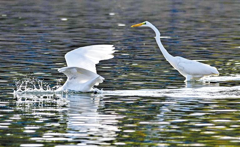 圖說甘肅丨鳴沙山下大漠濕地白鷺起舞