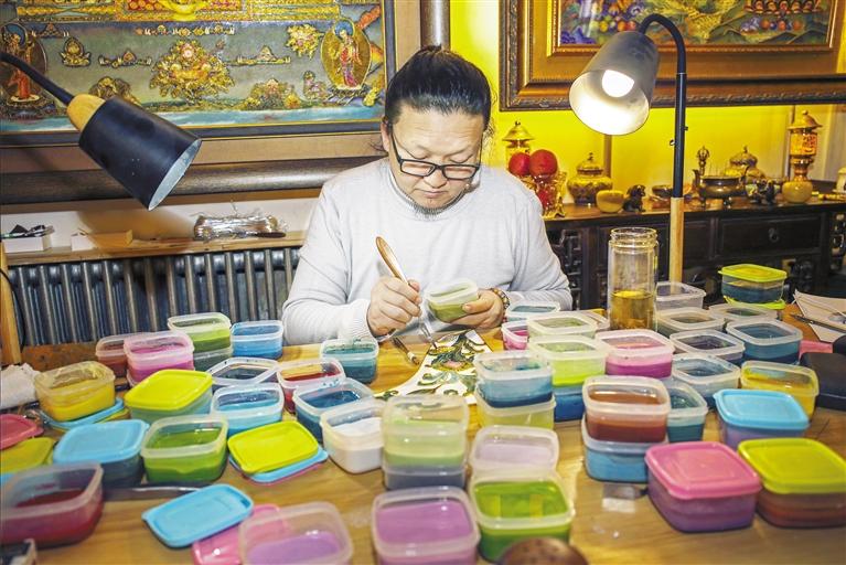 據(jù)李海明介紹,近年來,經(jīng)常會受邀代表甘肅省文創(chuàng)去省外參展,而每次展出的琺瑯文創(chuàng)產(chǎn)品都會受到來自各地的年輕人的好評。“有時(shí)會把不同人創(chuàng)作的壁畫、唐卡等擺在一起展出,總有很多年輕人在我的作品前逗留良久,這說明他們對我的琺瑯釉色彩是非常認(rèn)可的。”