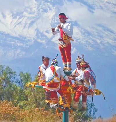 這些舞者表演的是墨西哥傳統(tǒng)的“飛天舞”儀式。“飛天舞”在墨西哥韋拉克魯斯州的托托納克人中盛行,現已成為該州帕潘特拉市代表性的文化標志。2009年,這項民間技藝被聯合國教科文組織列入人類非物質文化遺產代表作名錄。