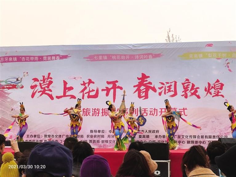 三月的敦煌,春風(fēng)拂面,漠上花開。鳴沙山下,十里杏花爭(zhēng)相綻放;黨河兩畔,千畝桃花含苞待放;春風(fēng)蕩漾,早酥梨基地花苞滿枝丫。鮮花以自己的嬌媚打開了戈壁大漠的春天。敦煌市將以“春”為韻腳,“花”為主角,開展“漠上花開·春潤敦煌”鄉(xiāng)村旅游振興系列活動(dòng)。包括“杏花帶雨·霓裳舞春”“桃花始開·詩詞吟春”“梨花千樹·曲藝鬧春”3場(chǎng)主場(chǎng)活動(dòng),以及徒步踏青、康體騎行、研學(xué)體驗(yàn)等5項(xiàng)主題活動(dòng),并將組織開展敦煌服走秀、桃花詩會(huì)、非遺曲子戲表演等多項(xiàng)鄉(xiāng)村旅游特色配套活動(dòng)。
