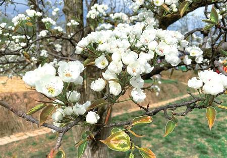 一樹樹、一朵朵雪白的梨花迎風(fēng)搖曳,散發(fā)出陣陣清香。