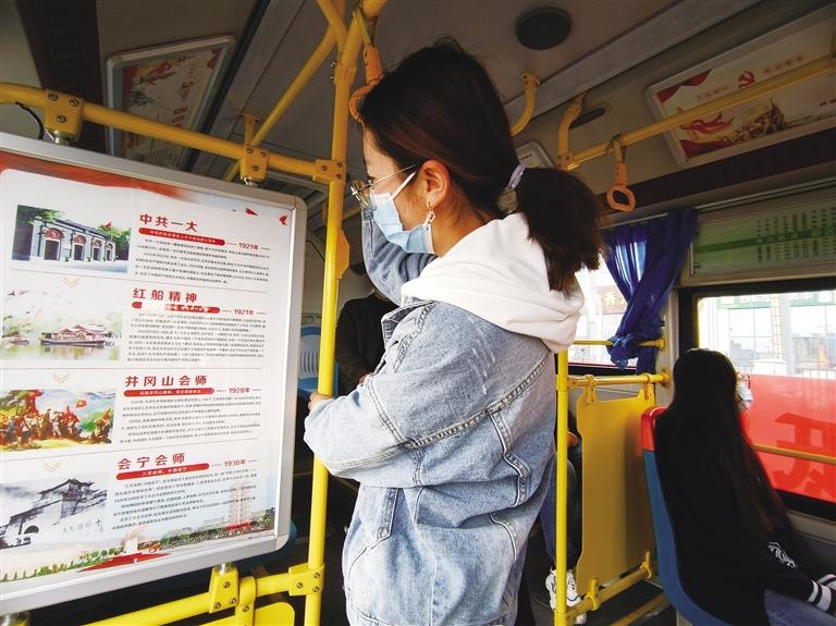 黨史學(xué)習(xí)教育主題車廂的車體外部掛有醒目的黨史宣傳標(biāo)語(yǔ),走進(jìn)車廂,風(fēng)道展板上以黨史故事的形式,圖文并茂、生動(dòng)形象地展示著紅船精神、井岡山精神、長(zhǎng)征精神、遵義會(huì)議精神、延安精神、西柏坡精神、抗美援朝精神、戰(zhàn)疫精神等內(nèi)容。車廂內(nèi)的座椅靠背、宣傳欄等處也印有不同的黨史宣傳知識(shí),公交車廂成了黨史學(xué)習(xí)教育的流動(dòng)“微課堂”。乘坐在黨史學(xué)習(xí)教育主題公交車上,乘客便可重溫中國(guó)共產(chǎn)黨波瀾壯闊的輝煌歷程,汲取民族復(fù)興的精神力量。
