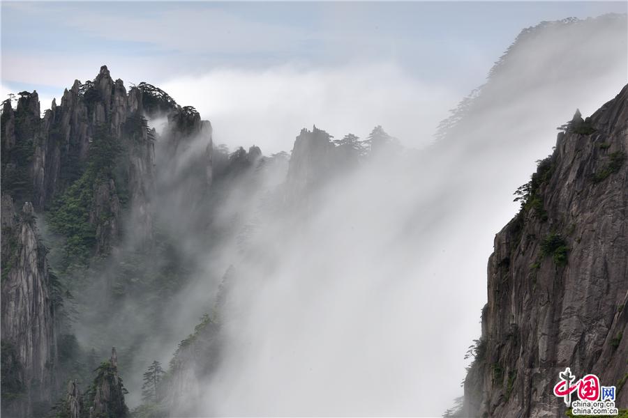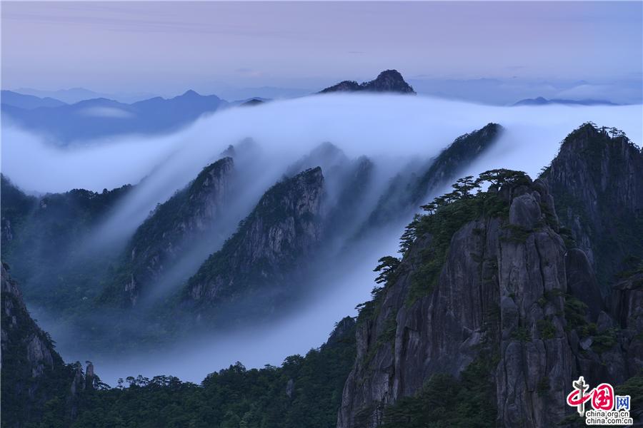 5月22日傍晚,雨后安徽黃山風(fēng)景區(qū)現(xiàn)壯觀的云海奇觀,見云海奔騰而來,越過北海的始信峰,沿著群峰傾瀉而下勢如瀑布之壯觀,在奇群、怪石和形態(tài)各異黃山松的作用下勾勒出一幅幅流動(dòng)的水墨畫;黃山不僅是云霧之鄉(xiāng),更是中國傳統(tǒng)水墨畫的天然的素材。(姚育青)