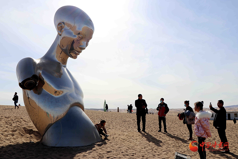 春節(jié)期間,甘肅省民勤縣蘇武沙漠雕塑藝術(shù)主題公園117件不同材質(zhì)、不同風(fēng)格的雕塑藝術(shù)佳作,高聳在靜謐的蒼穹之下,在茫茫沙漠中,與藍(lán)天白云相映成趣,盛迎四海賓朋前來觀光旅游,讓孤寂的沙漠,成為了熱門的“打卡地”。
