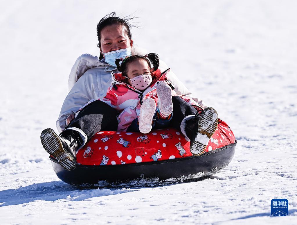 2月19日,市民在寧夏銀川市閱?;﹫?chǎng)滑雪圈。