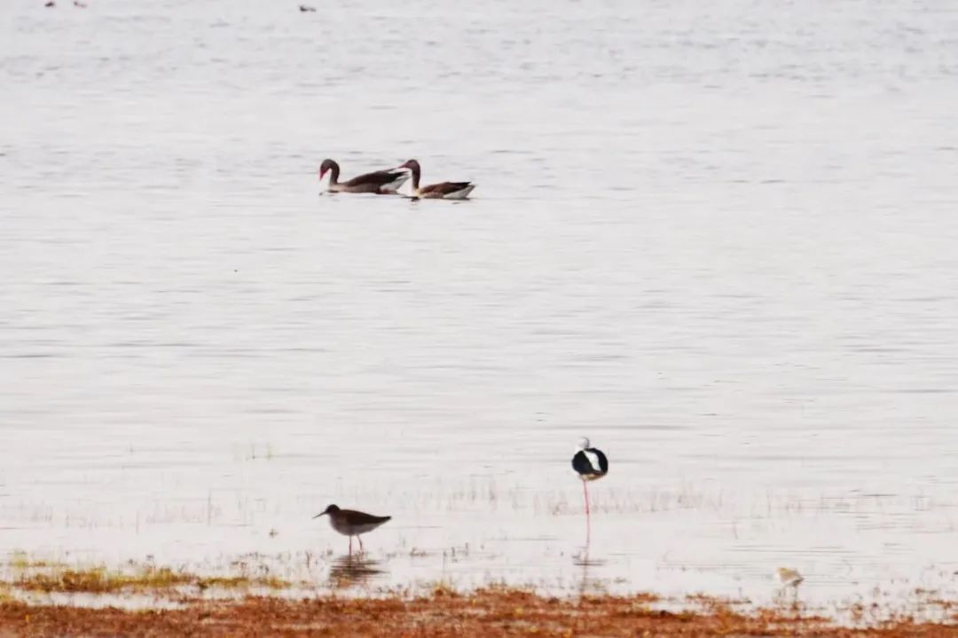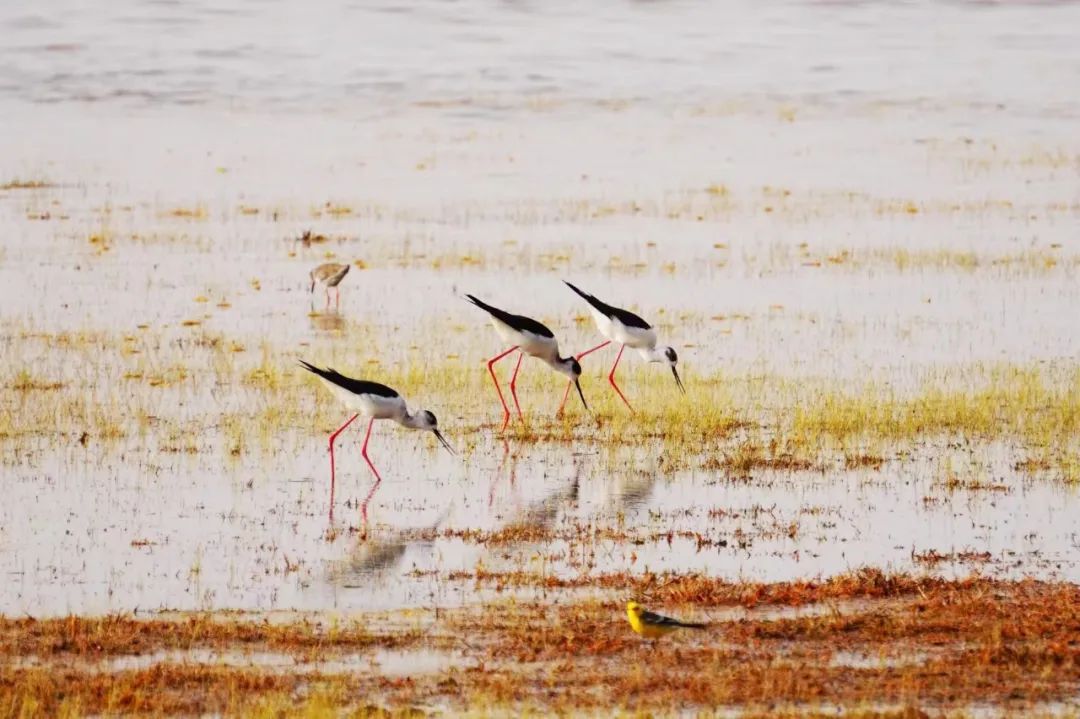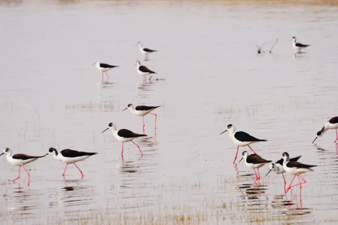 四月的敦煌大地春和景明,在庫姆塔格沙漠的邊緣,位于陽關(guān)濕地的壽昌海子波平如鏡,碧水映襯著祁連山上的雪峰,各種色彩斑斕地鳥兒仿佛收到了春天的邀約,在這里參加一場盛大的聚會(huì)。它們有的在湖面上引頸入水自在覓食,有的踏波翩翩起舞,有的追逐嬉戲鳴唱,有的在岸邊閑庭信步、悠然自得地曬太陽......構(gòu)成了一幅多姿多彩的和諧自然生態(tài)畫卷。