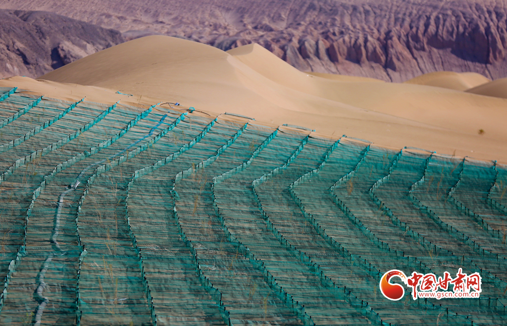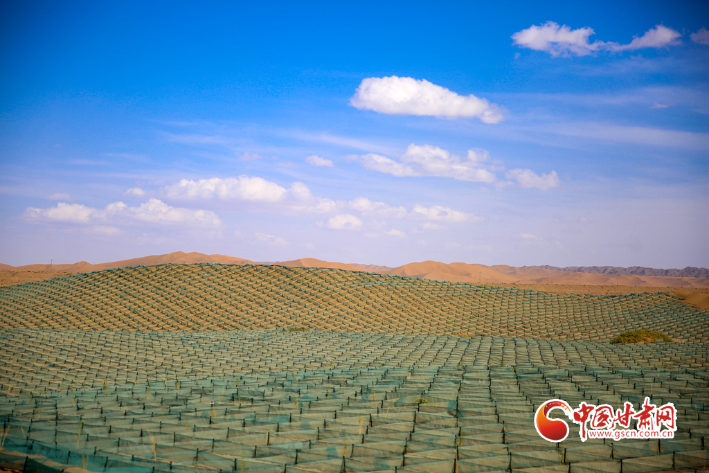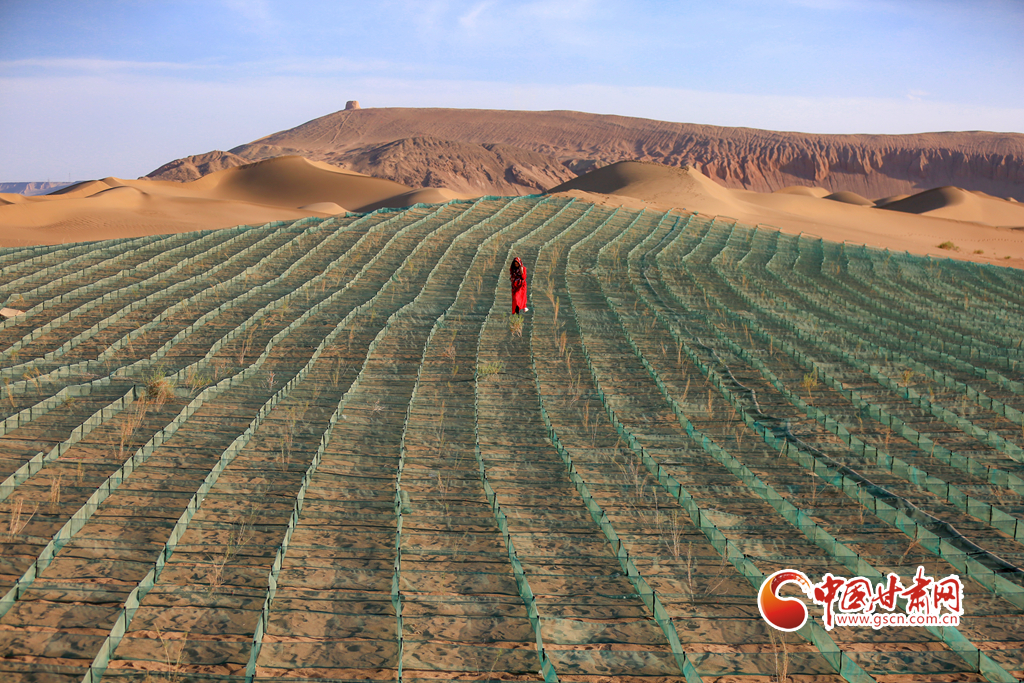 5月14日,在甘肅省酒泉市金塔縣鼎新鎮(zhèn),一片片種植梭梭的阻沙網(wǎng)排列有序,讓風(fēng)沙得到有效治理。