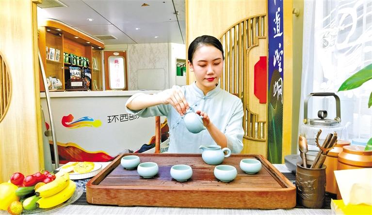 這趟列車由6節(jié)軟臥車廂、1節(jié)餐車、1節(jié)休閑娛樂功能車組成,車體內外隨處可見平涼文化旅游元素。記者在車廂內看到,崇信龍泉寺、華亭安口窯古村落、靜寧仙人峽……每一間軟臥門上都是絕美的平涼風光大片,整個車體儼然移動的“平涼文旅展館”,讓人“身未動,心已遠”。車體中部的功能車,更是顛覆了以往人們對火車的認知,麻將桌、功夫茶、全套的K歌設備,還有平涼特色文旅商品、農特產品展銷區(qū),平涼文旅書刊閱覽區(qū)、平涼文化主題報刊欄,足以打發(fā)游客在旅途中的無聊時光。餐車也極富特色,車廂頂部裝飾有色彩豐富的藻井圖案,飛天仙子衣袂飄飄、環(huán)繞四周。“在這樣的餐車上吃飯,吃的那是品位。”一位乘客開心地和同行的伙伴說著。62歲的張女士一到平涼就忙不迭地給女兒發(fā)微信,“火車上住得舒適,服務好,環(huán)西部火車游·崆峒號很超值!”