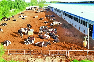 張掖市高臺(tái)縣巷道鎮(zhèn)東聯(lián)村的奶牛養(yǎng)殖場(chǎng) 藺鵬攝/光明圖片
