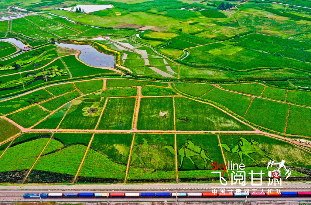 7月13日清晨,一場小雨過后,張掖市甘州區(qū)烏江鎮(zhèn)新河田園綜合體稻田景觀區(qū)內(nèi)2000多畝稻田塵埃盡洗,一幅幅彩稻畫栩栩如生,從高處俯瞰,田園風(fēng)光和生態(tài)美景展現(xiàn)在人們眼前。