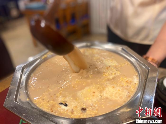 5月28日,呼和浩特市一家奶茶店里,服務員薩拙拉將黃油、炒米等奶茶“伴侶”放入熱鍋中。中新社記者 張瑋 攝