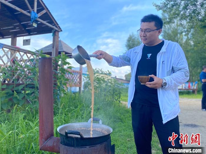 7月21日,游客在牧民家體驗熬奶茶。中新社記者 張瑋 攝