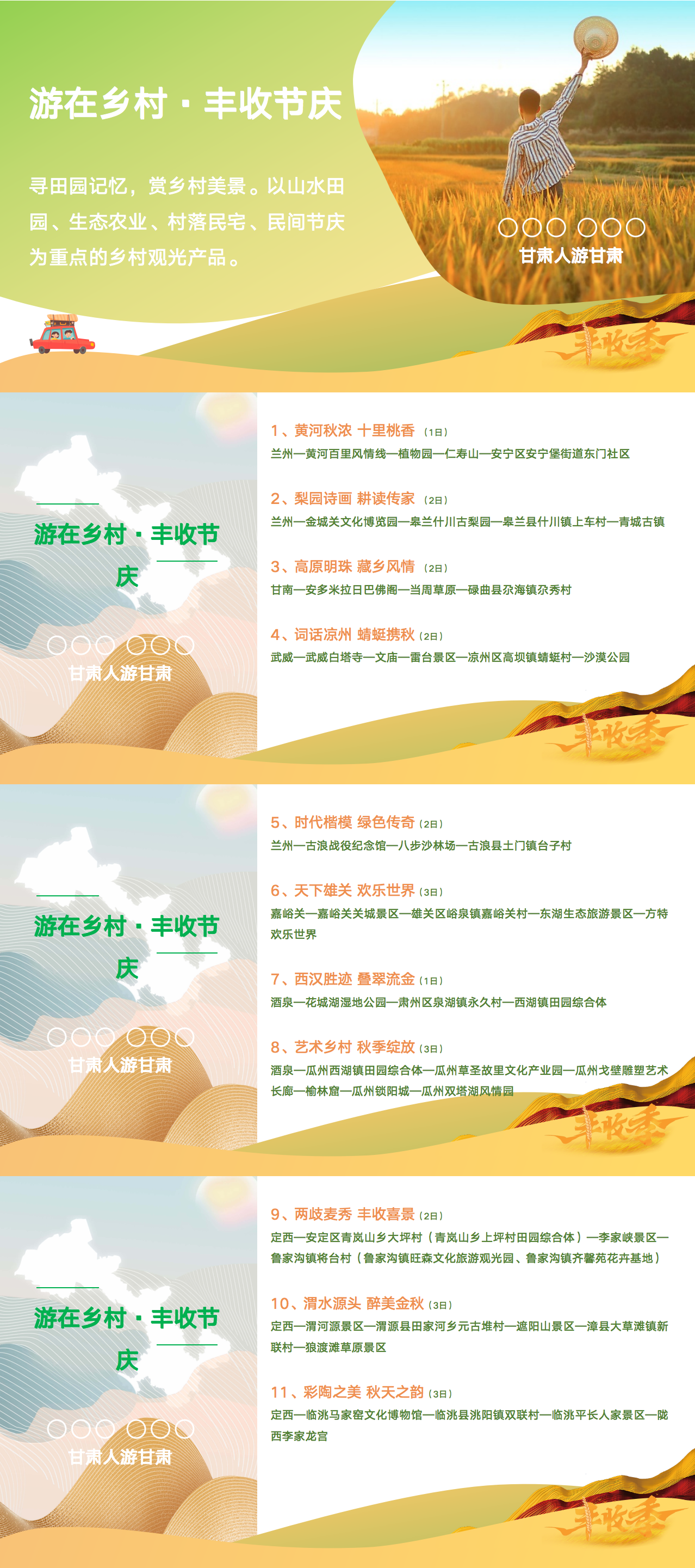 這5大類線路具體包括:游在鄉(xiāng)村·豐收節(jié)慶、玩在鄉(xiāng)村·花田拾遺、悟在鄉(xiāng)村·鄉(xiāng)土新知、品在鄉(xiāng)村·康養(yǎng)鄉(xiāng)居、賞在鄉(xiāng)村·臻味清歡,涵蓋了鄉(xiāng)村觀光、美食、住宿、游玩、體驗(yàn)、研學(xué)、康養(yǎng)等內(nèi)容,為金秋時(shí)節(jié)游客出行提供豐富的選擇,也為甘肅文旅市場聚人氣、促消費(fèi)提供了重要載體。