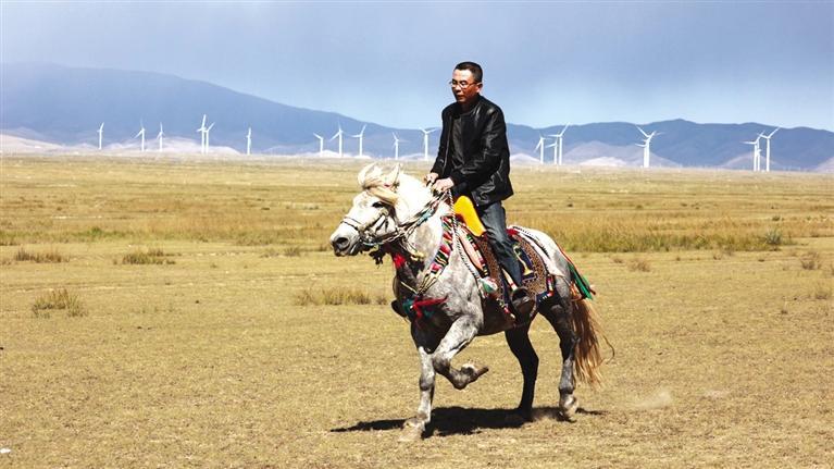 驅(qū)車向草原腹地進(jìn)發(fā),遠(yuǎn)遠(yuǎn)就能看見(jiàn)有人在馴馬。馴馬者房利軍和他的坐騎“尕青”仿佛“人馬合一”,同呼吸、共步調(diào),一遍遍練習(xí),像走,更像飛。這便是傳說(shuō)中的走馬文化,和跑馬的加速度不同,走馬不管是走還是跑,都是快步勻速,短途速度快,長(zhǎng)途耐力強(qiáng),騎乘平穩(wěn),姿態(tài)優(yōu)美,觀賞性強(qiáng)。在牧區(qū),走馬實(shí)用性強(qiáng),深受當(dāng)?shù)厝藲g迎。曾有專家稱,“馬踏飛燕”的“馬”即為走馬。每天,和武威天祝一山之隔的這片草原,都與房利軍有關(guān),在這里,他專心馴馬,而他的500只羊則在一旁撒歡。尤其從高空俯瞰,草原牧羊的畫面甚是壯觀。看完馴馬,房利軍騎馬帶路,采訪車沿著馬道回到了“家”。