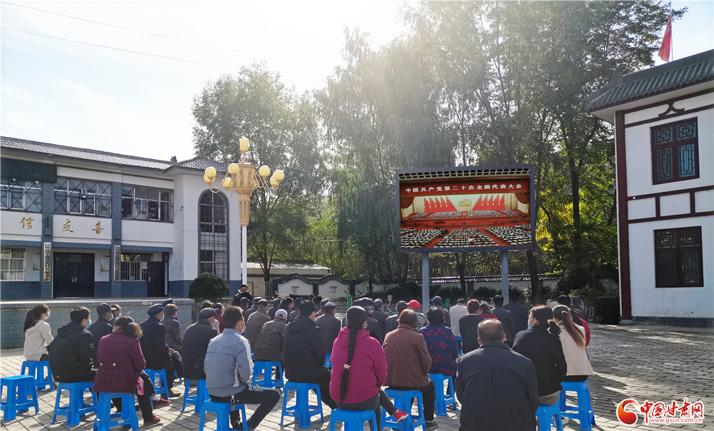 平?jīng)鍪袥艽h汭豐鎮(zhèn)鄭家溝村干部群眾早早來到村公共服務(wù)中心廣場,通過大屏幕收看大會開幕盛況。