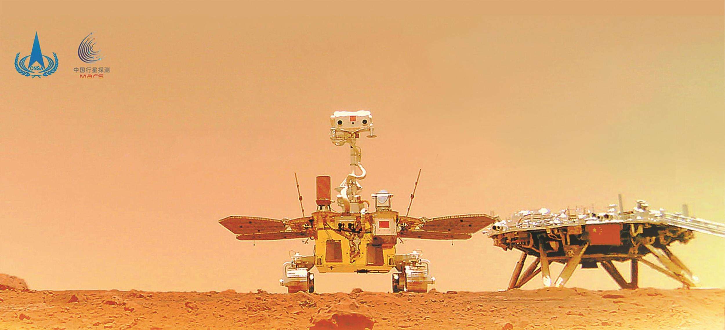 中國(guó)首次火星探測(cè)天問(wèn)一號(hào)任務(wù)“祝融號(hào)”火星車與著陸器合影。國(guó)家航天局供圖