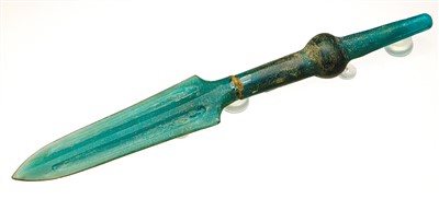 來自湖南博物院的西漢玻璃矛是本次展覽的明星展品之一。玻璃矛為綠色半透明狀,長18.8厘米,刃寬2.2厘米,矛脊兩側有槽,矛柄作圓柱狀,柄中部凸起成圓球形。這種兵器造型的玻璃制品非常罕見,專家推測其為禮器或明器。這件玻璃矛是本土工匠在吸收地中海玻璃制造技術的基礎上制作而成,反映了西漢玻璃工藝的高超水平,是研究玻璃文化傳播的重要實物資料。