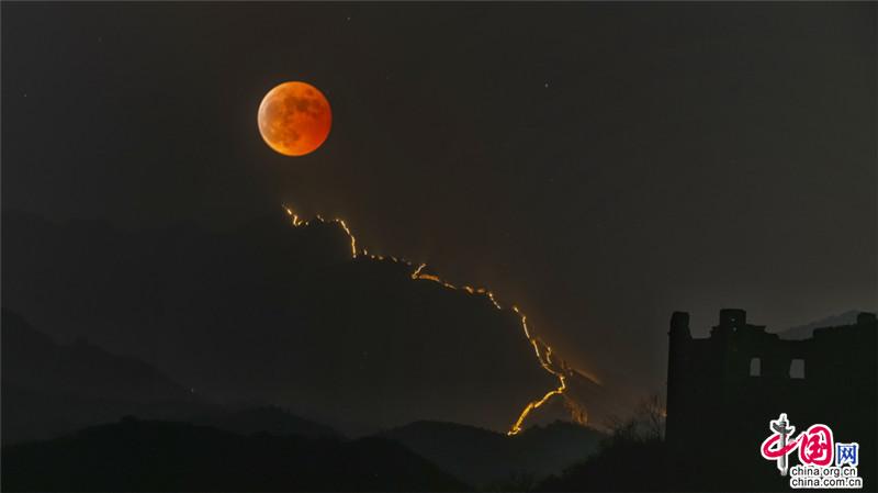 11月8日,月全食(紅月亮)天象驚艷亮相金山嶺長城。(紀(jì)正權(quán) 張愛東)