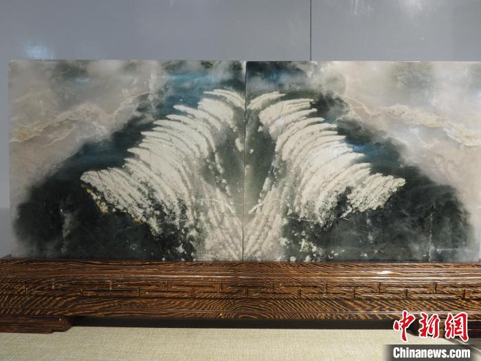 圖為現(xiàn)場(chǎng)展出的一塊奇石,其圖案有如瀑布飛流直下。李嬌陽(yáng) 攝