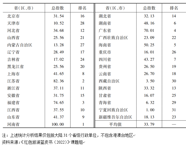 近日,北京第二外國語學(xué)院旅游科學(xué)學(xué)院與社會(huì)科學(xué)文獻(xiàn)出版社共同發(fā)布了紅色旅游藍(lán)皮書《中國紅色旅游發(fā)展報(bào)告(2022)》(以下簡稱《藍(lán)皮書》)。《藍(lán)皮書》指出,中國紅色旅游發(fā)展水平持續(xù)提升,31個(gè)省級(jí)行政單位(不含港澳臺(tái)地區(qū))的紅色旅游發(fā)展指數(shù)排名中,位列前十的依次為河南省、江蘇省、福建省、廣東省、海南省、湖南省、四川省、上海市、山東省、江西省。