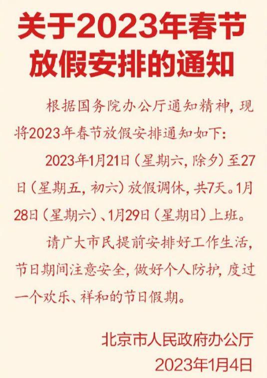 1月4日,北京市人民政府辦公廳發(fā)布《關于2023年春節(jié)放假安排的通知》(以下簡稱《通知》)。《通知》指出,根據國務院辦公廳通知精神,現將2023年春節(jié)放假安排通知如下:2023年1月21日(星期六,除夕)至27日(星期五,初六)放假調休,共7天。1月28日(星期六)、1月29日(星期日)上班。