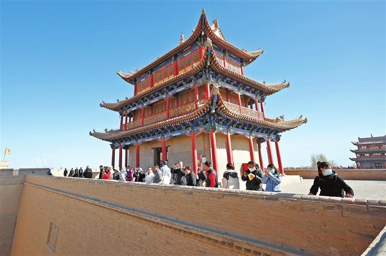 3月4日,游客在嘉峪關(guān)關(guān)城景區(qū)參觀游覽。春暖復(fù)蘇,甘肅省不少古絲綢之路節(jié)點城市喜迎旅游開門紅。在擁有世界文化遺產(chǎn)的甘肅省嘉峪關(guān)市,歷史文化古跡、現(xiàn)代主題樂園、夜市等景點,都吸引了不少游客前來游覽體驗。今年以來,當?shù)赝瞥鑫穆孟M券、景點優(yōu)惠套票、獎補扶持政策等一系列措施,提振文旅消費市場信心,助推絲路文旅產(chǎn)業(yè)強勁復(fù)蘇。