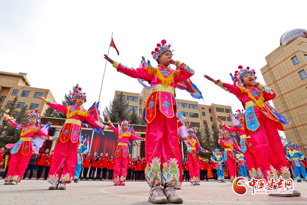 3月22日,在甘肅省張掖市民樂縣洪水小學,戲曲演員正在給同學們指導戲曲動作、傳授唱腔。