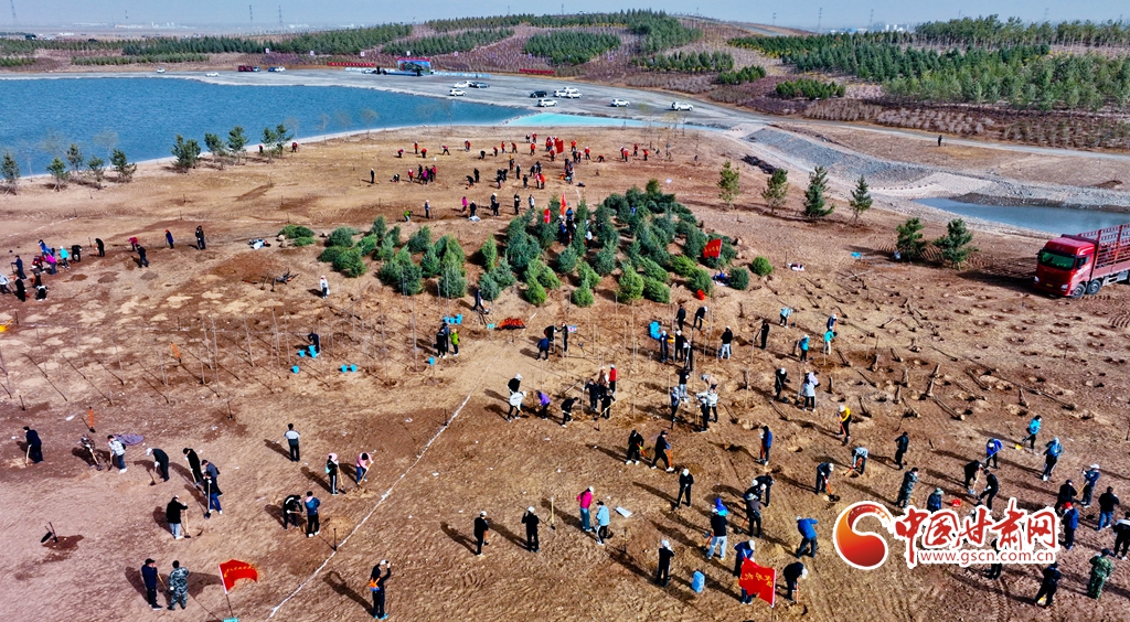 4月11日,在甘肅省張掖市甘州區(qū)黑河西岸黑河灘彩虹林海生態(tài)造林示范區(qū)內(nèi),眾多干部職工正在植樹。
