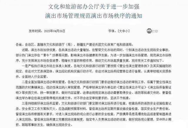 近日,文旅部辦公廳發(fā)布《文化和旅游部辦公廳關(guān)于進(jìn)一步加強(qiáng)演出市場(chǎng)管理規(guī)范演出市場(chǎng)秩序的通知》。通知提到,對(duì)臨時(shí)搭建舞臺(tái)、看臺(tái)的演唱會(huì)、音樂節(jié)等大型演出活動(dòng),文化和旅游行政部門要做好演出現(xiàn)場(chǎng)監(jiān)管,查驗(yàn)演出舉辦單位的演出批準(zhǔn)文件及相關(guān)手續(xù),核驗(yàn)演員信息及演出節(jié)目?jī)?nèi)容,嚴(yán)禁擅自變更演員及演出內(nèi)容,嚴(yán)禁假唱、假演奏等違法違規(guī)行為。