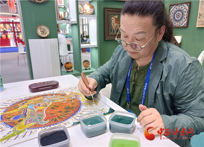 深圳文博會首日,李海明選擇現場制作九色鹿掐絲琺瑯畫。