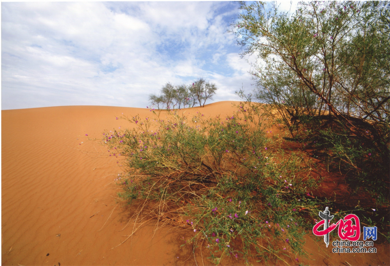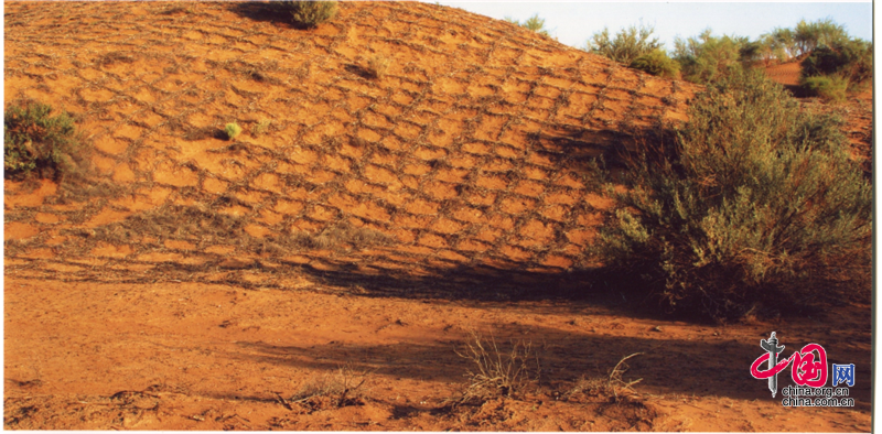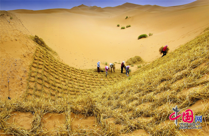 小小的“麥草方格”不僅阻止了流沙,防止了荒漠化,還加速了當(dāng)?shù)亟?jīng)濟的發(fā)展。“麥草方格”固沙法即:將廢棄的麥草呈方格狀鋪在沙面上,然后用鐵鍬軋進(jìn)沙中,留麥草的三分之一或一半立在四周,并在方格中植入治沙人經(jīng)九次試驗成功培育出的花棒、檸條等沙生植物,腐爛干枯的麥草還作為肥料滋養(yǎng)植物的生長。