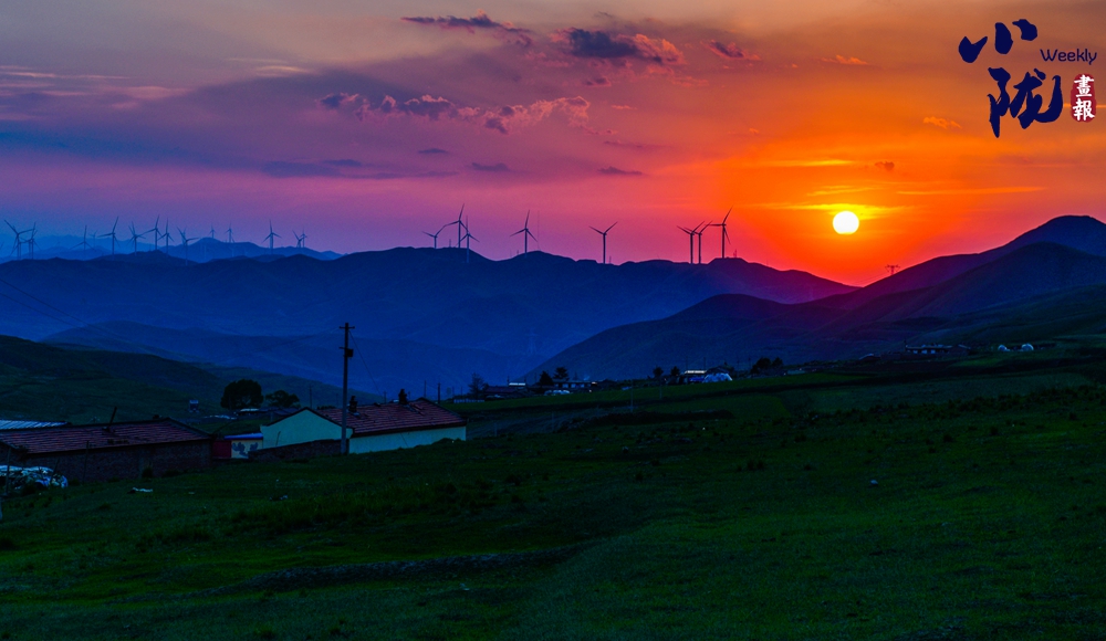 晚霞染天際,崇山峻嶺間,一臺臺風力發(fā)電機,像一排排駐守在各個山頭的哨兵,挺立著身軀,成為新墩灣草原的獨特風景。
