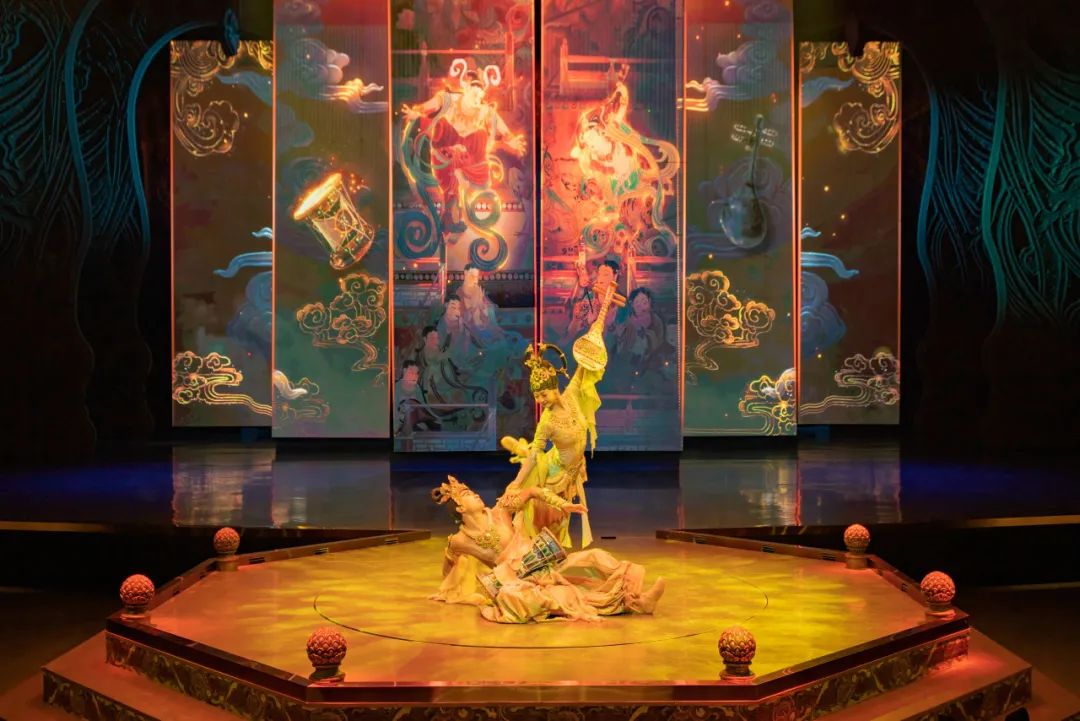 劇中運(yùn)用了五弦琵琶、排簫等民族樂器及敦煌仿制樂器,演繹了胡旋舞、琵琶舞等敦煌舞蹈,配合取材自敦煌古樂譜和西域曲調(diào)的劇目樂曲,還原了敦煌壁畫中的樂舞盛景。在演出模式上,《樂動(dòng)敦煌》打破了人和舞臺(tái)間的界限,讓觀眾置身劇場,近距離感受敦煌傳承千年的古樂文化魅力。