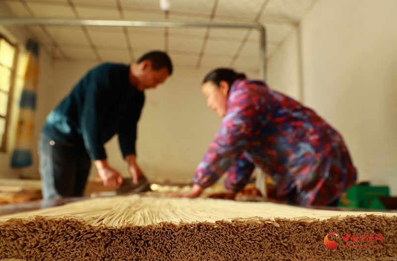 近日,在甘肅省隴南市康縣周家壩鎮(zhèn)周家壩村,村民周珍珍家正在抓住晴好天氣制作傳統(tǒng)純手工掛面,供應年貨市場。