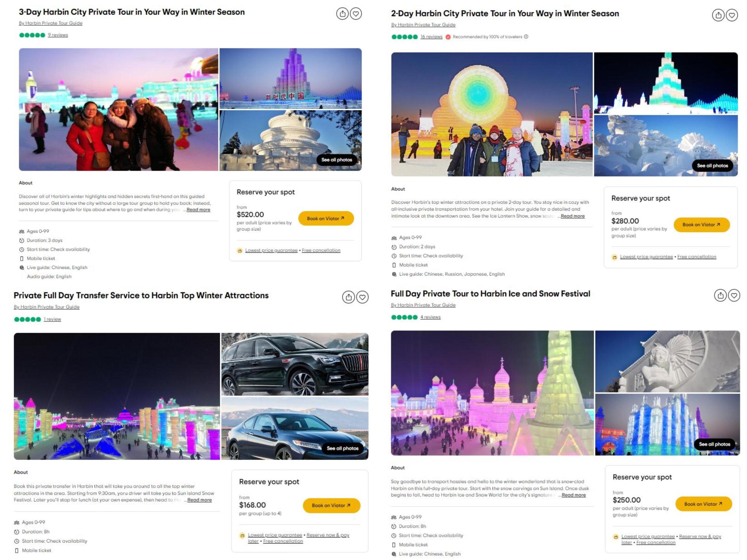 在線預(yù)訂平臺Agoda上也可以搜索到數(shù)十個關(guān)于哈爾濱旅游的服務(wù)。大約8小時的“哈爾濱一日游”,包括私人導(dǎo)游服務(wù)和用車費用,收費97美元起。為期2天的“哈爾濱市私人旅游”,包括私人導(dǎo)游服務(wù)、交通費(私人汽車或公交車/出租車)、酒店接送,收費249美元起。(中新網(wǎng)財經(jīng) 記者 吳家駒)