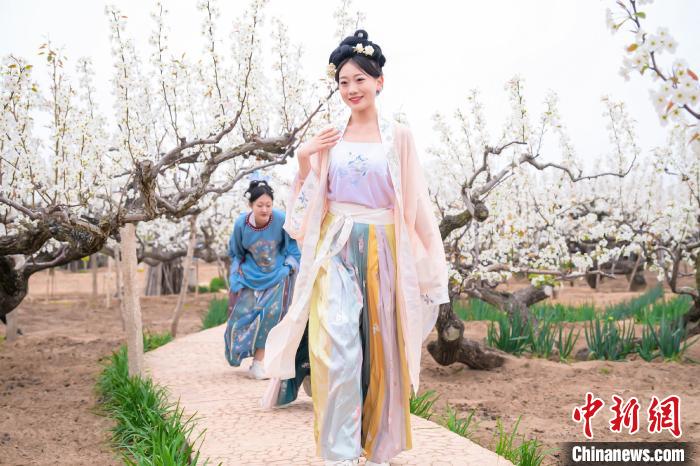 連日來(lái),山東萊陽(yáng)呈現(xiàn)“千樹萬(wàn)樹梨花開”的盛景,上萬(wàn)畝梨園內(nèi)的梨花次第開放,吸引游客著古裝游園。