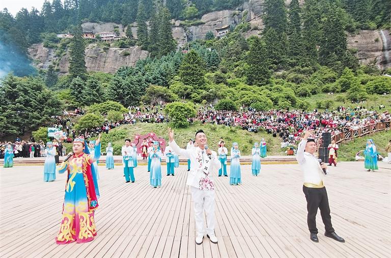 六月的松鳴巖滿目蔥郁、碧水悠悠,讓人如在畫(huà)中游。三孔橋會(huì)場(chǎng)內(nèi)早已是人山人海,熱鬧非凡,伴隨著歡快的歌曲,由1600多人組成的花兒串燒巡演團(tuán)隊(duì)在這里載歌載舞,共同唱響《花兒留住天下客》,將活動(dòng)推向了高潮,歌聲和掌聲是人們對(duì)幸福生活的感恩之情和對(duì)美好明天的憧憬。