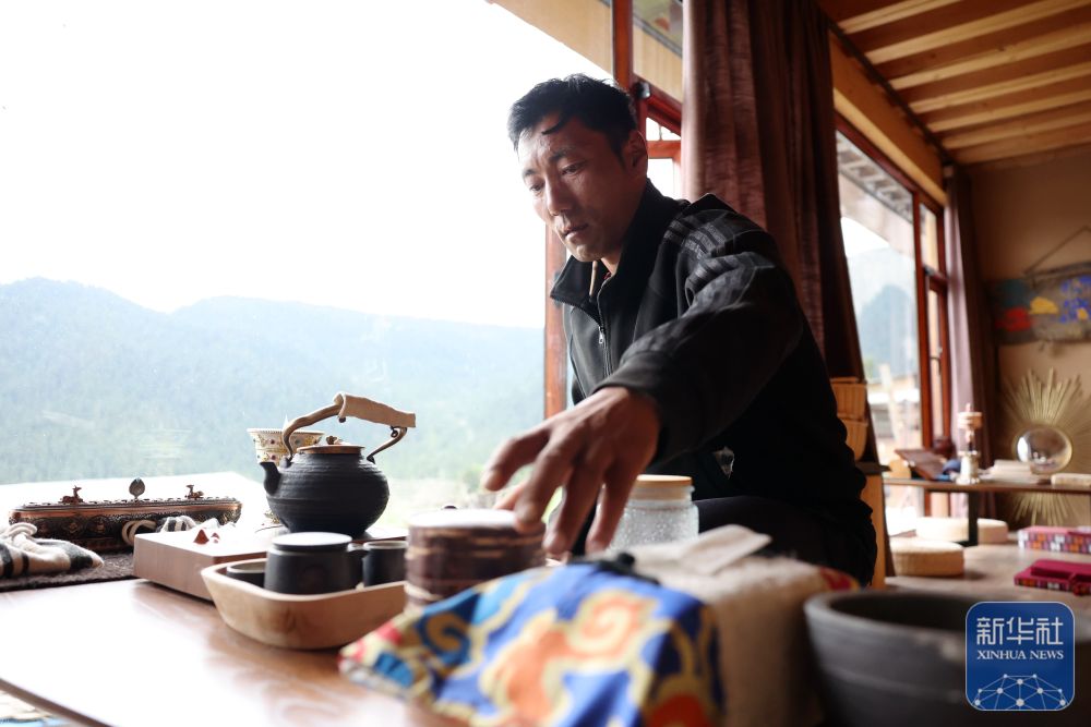 ↑ 扎尕那景區(qū)一家民宿經(jīng)營者卓瑪交在自家的民宿里整理茶臺(tái)(6月27日攝)。新華社記者 方欣 攝