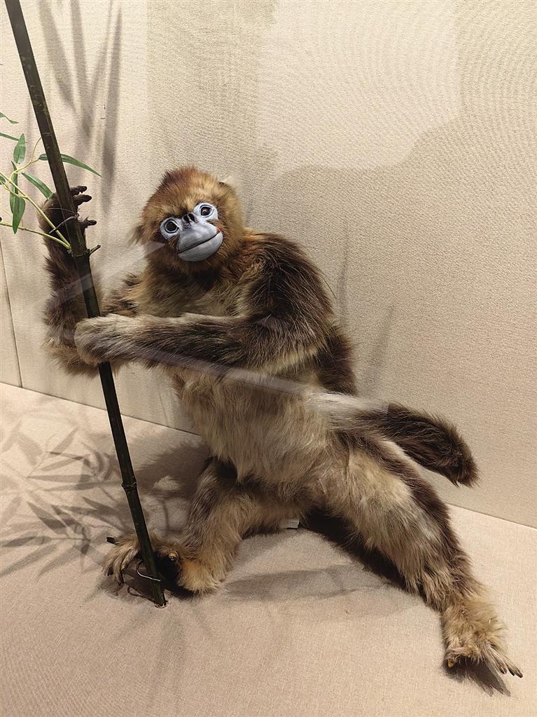 展出的動(dòng)物標(biāo)本中,最受歡迎的莫過于“萬人迷”大熊貓。旁若無人地啃著竹子,眼中只有美食和下一頓美食。