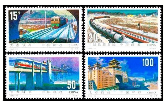 1996年9月,我國發(fā)行編號為1996-22的《鐵路建設(shè)》郵票一套四枚,其中T4-2圖為蘭新鐵路復(fù)線。票面上,一貨一客兩列火車蜿蜒在蘭新鐵路復(fù)線,氣勢如虹。而嘉峪關(guān)關(guān)城作為一個地理標志,被處理成蘭新鐵路復(fù)線的背景圖案,放在郵票主圖的后方。盡管由于票面所限,背景圖案上的嘉峪關(guān)關(guān)城畫面很小,無以淋漓盡致地表現(xiàn)嘉峪關(guān)城樓的細節(jié),但其“天下第一雄關(guān)”的雄姿絲毫不減。而嘉峪關(guān)出現(xiàn)在表現(xiàn)甘肅特色乃至蘭新交通主線的票面上,也足見其地理位置的重要性。