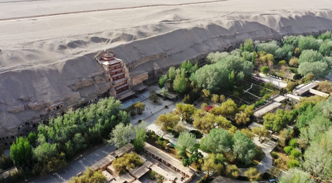 敦煌莫高窟窟區(qū)(無人機(jī)照片)。記者 陳斌 攝