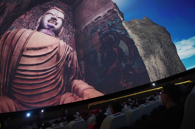 游客在莫高窟數(shù)字展示中心觀看球幕電影《夢(mèng)幻佛宮》。記者 陳斌 攝