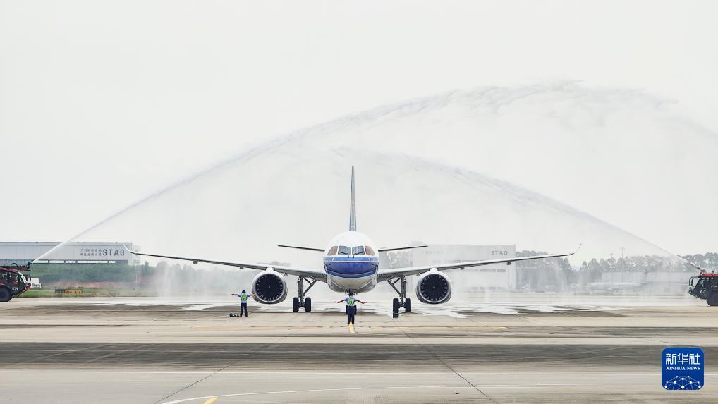 8月29日,南航首架C919國(guó)產(chǎn)大飛機(jī)在廣州白云國(guó)際機(jī)場(chǎng)緩緩穿過(guò)“水門”。新華社發(fā)